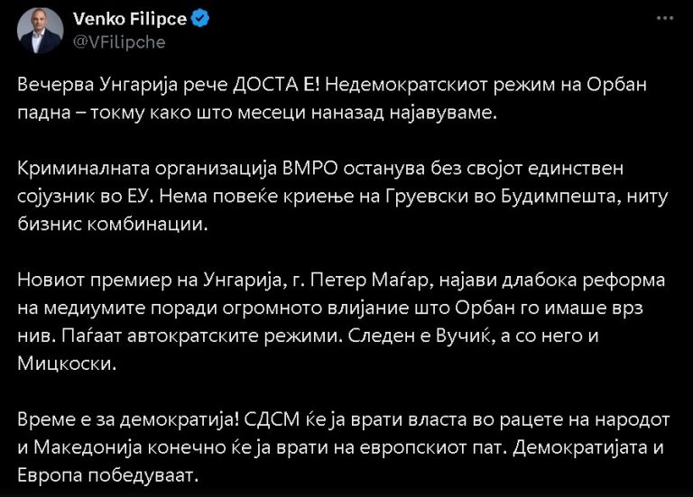 “Вадењето на јазикот од извештајот е пораз на владината дипломатија, која не успеа да подобри ништо од позициите кои ги наследи, туку како со булдожер ги сруши. Тие ги срушија нашите европски перспективи и го изложија нашиот народ на потсмев, правејќи го целосен губитник. Извештајот не е извештај за постоењето на македонската нација, македонскиот јазик или македонскиот идентитет но македонската интеграција во Унијата е сè подалечна поради политиките и изборите на власта“, рече Филипче.